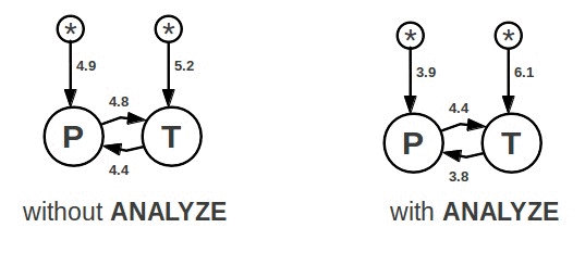 In the "without ANALYZE" case on the left, the NN algorithm chooses loop P (PLINK) as the outer loop because 4.9 is less than 5.2, resulting in path P-T which is algorithm-1. NN only looks at the single best choice at each step so it completely misses the fact that 5.2+4.4 makes a slightly cheaper plan than 4.9+4.8. But the N3 algorithm keeps track of the 5 best paths for a 2-way join, so it ends up selecting path T-P because of its slightly lower overall cost. Path T-P is algorithm-2.